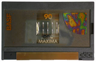 - Digital Compact Cassette (DCC) is a magnetic tape-based moving image format. The tape is composed of magnetic particles (chromium dioxide- or cobalt- doped ferric-oxide), a binder, and a polyester base. DCC uses PASC (Precision Adaptive Sub-band Coding) compression in order to store the amount of information required for CD-quality sound on an audiotape. The cassette cartridge and tape width is the same as an analog compact cassette (approximately 4" × 2½" × ½" with a ⅛" tape). The cassettes look similar to analog audio cassettes except they only have access holes for the transport hubs on one side. Also, the tape path is shielded by a metal slider similar to those found on a 3.5 inch floppy disc.
